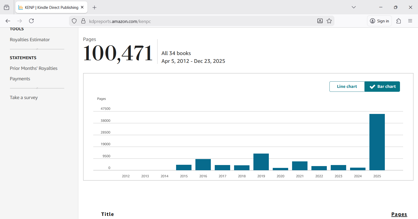 A100K YEAR: What a GREAT year for Book Sales and Page Reads. Our special thanks go to all of you for helping us reach our publishing goals for 2025. For the Author, it has been a complete revelation commercially, with some titles exceeding all expectations. As storytellers it has been one of the most satisfying years we can remember, knowing so many of you have read ... and continue to read our titles. So, we wish all our readers a very happy and prosperous 2026. To all you potential authors, looking to finish that very first but still annoyingly elusive first full length novel, we say ... Don't Give Up!